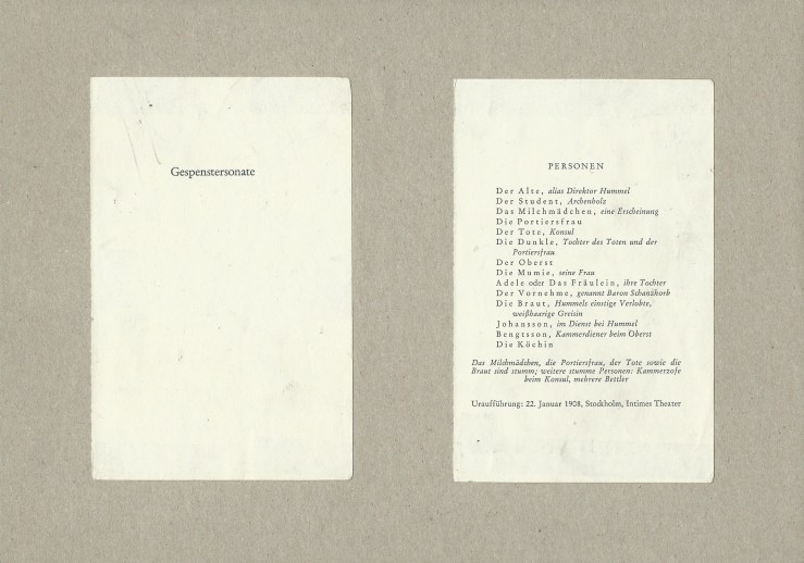 The Ghost Sonata came into being in February and March 1907. Like the new form of drama, this play as well refers to the classical music history. As examples: The Student is asked by The Old Man to go to the afternoon performance of the Valkyrie, The Old Man describes his life as a fairy tale book with fairy tales, and ”a single thread joins them together, and the same theme, the leitmotif, returns again and again, like clockwork”, Adele plays the harp, the rhythmical ticking of the wall clock, and the last stage directional note of Strindberg reads: